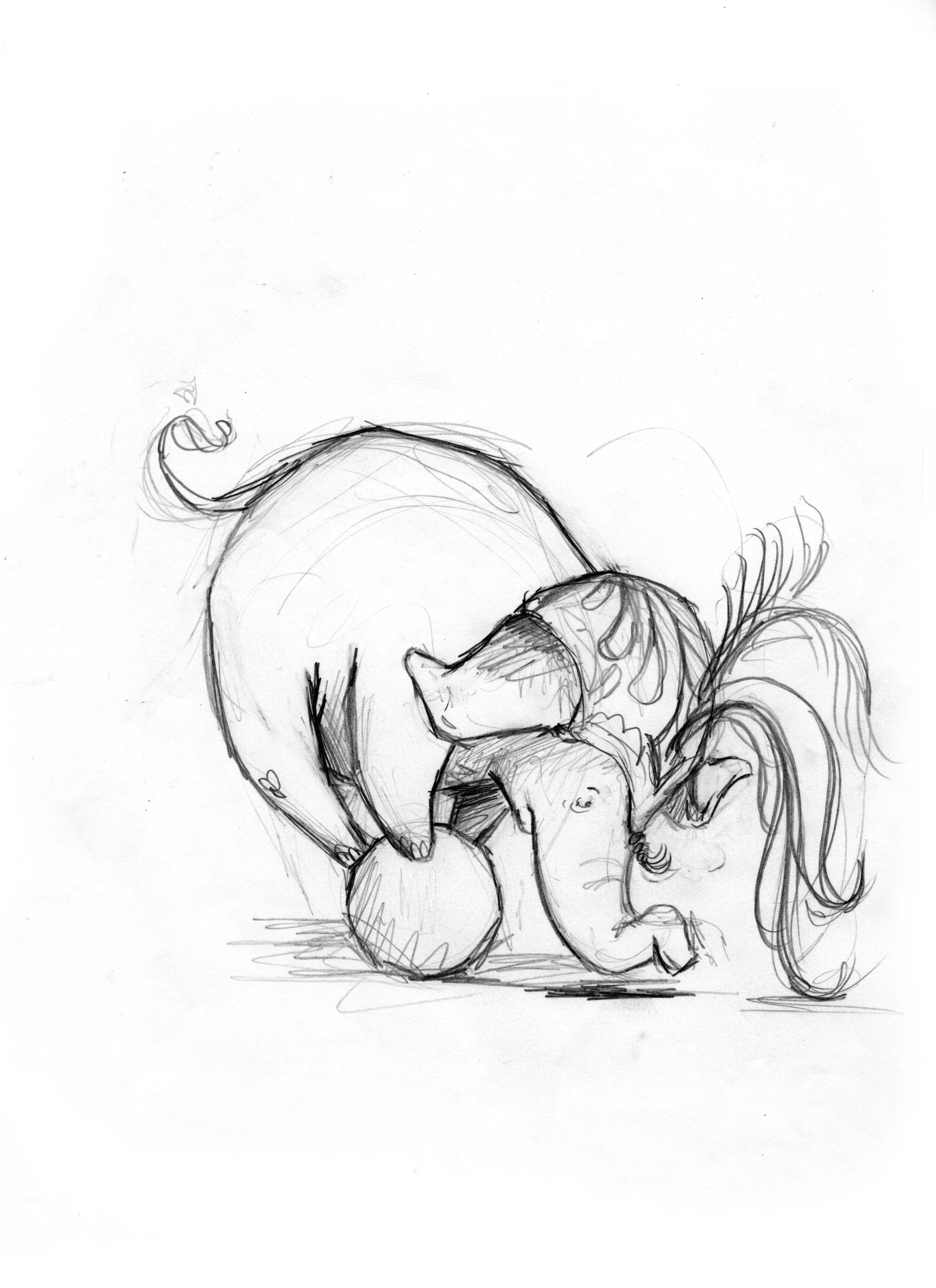 I did a series of drawings of Stella trying her best to find her balance on top of this circus ball but this one was my favorite. Here, she's just lifted her trunk off the ground and is holding on tight to that moment: "Will I make it?' or 'Will I fall on my face?'